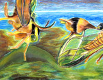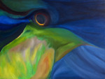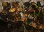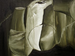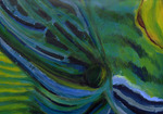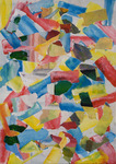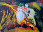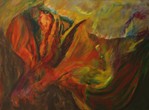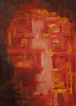 2016Bij dit schilderij heb ik me laten sturen door steeds opnieuw te luisteren naar delen 3 en 4 van Sonate voor cello en piano in C majeur, opus 119 van Prokofiev, uitgevoerd door Harrel en Ashkenazy. Het derde deel is langzaam met contrast tussen de overwegend donkere klanken van de piano an de kwetsbare hogere tonen van de cello. Het vierde deel is veel sneller, lichtvoetiger en meer staccato.
